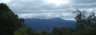 Allow 3hrs for the up and 3 hrs for the down and take your camera. (Photo :' the terrible mountain' shrouded in cloud, 1335m high, photographed after the worst section of Lazarini's Spur. Note 3 little evil hills on the left/south) Also see photos in journal.